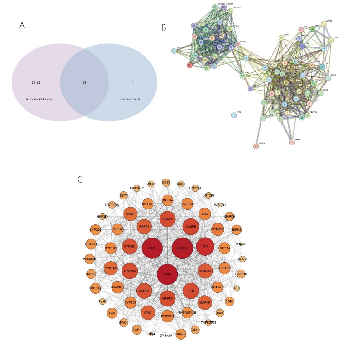 Objective: To systematically analyze the potential therapeutic mechanism of licochalcone A against Alzheimer's disease by network pharmacology. Methods: The Comparative Toxicogenomics Database (CTD) and GeneCards database were screened, and Gene Ontology (GO) enrichment analysis and Kyoto Encyclopedia of Genes and Genomes (KEGG) pathway analysis were performed on the overlapping genes of Alzheimer's disease and licochalcone A, followed by Protein-Protein Interaction (PPI) analysis and visualization. Results: A total of 64 potential overlapping targets between licochalcone A and Alzheimer's disease were identified, among which CASP3, AKT1 and BCL2 were core targets with high degree values. The annotated genes were enriched in signal transduction, metabolism and immune system. Conclusion: Licochalcone A may exert anti-Alzheimer's disease effects by targeting and regulating inflammatory response, participating in biological processes such as signal transduction and energy metabolism, which provides a theoretical basis for the development of multi-target drugs for Alzheimer's disease.